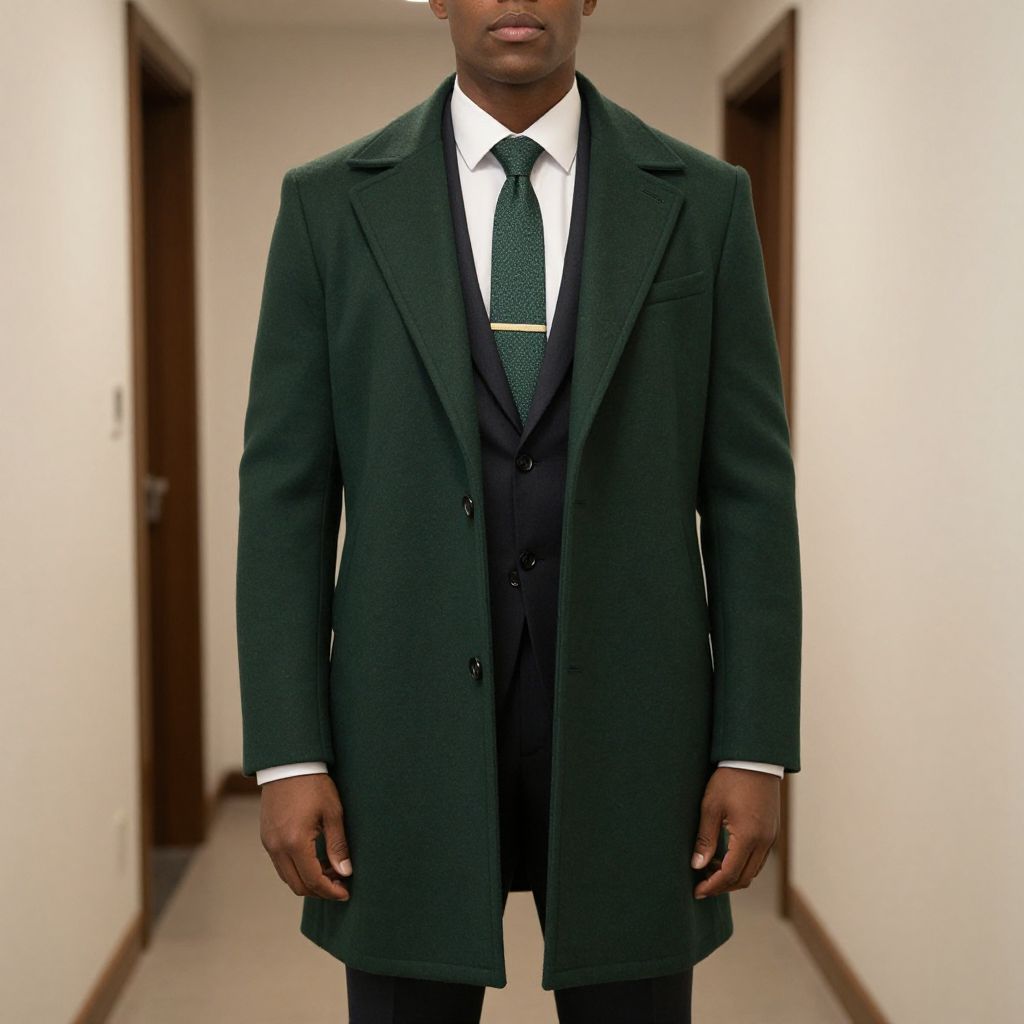 Photograph of a tall, dark-skinned man standing in a narrow, white-walled hallway with wooden doors on either side. He is wearing a dark green overcoat over a black three-piece suit with a white dress shirt and a green polka-dotted tie. His hands rest by his sides, and his face is partially visible, showing a neutral expression. The hallway has a beige carpet and brown baseboards, creating a stark contrast with his dark attire. The lighting is bright, highlighting the formal, stylish look.