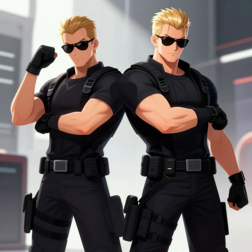 Digital illustration of two animated Albert Wesker characters from Resident Evil, featuring blonde slicked-back hair, red eyes, black sunglasses, black gloves, and muscular build. Both wear black tactical clothing and display confident poses in a dynamic, modern environment.