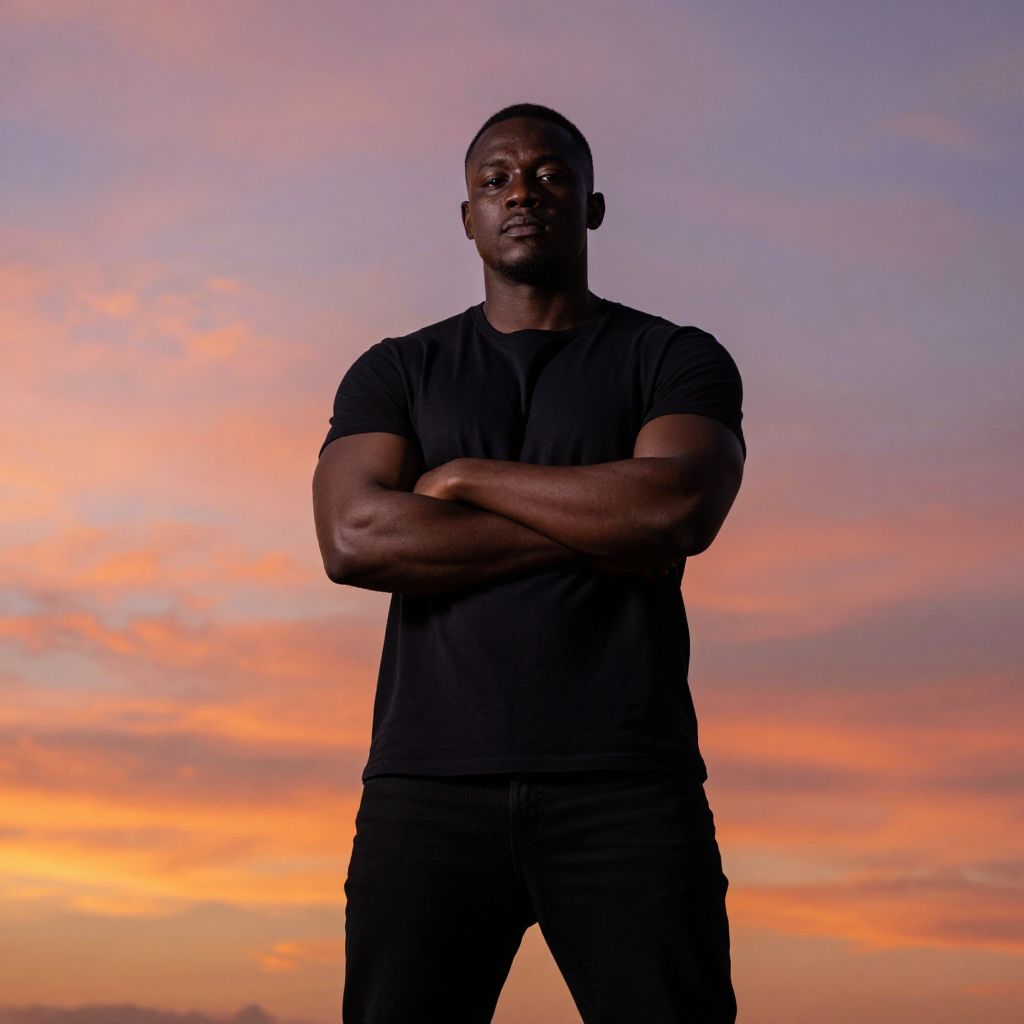 Photograph of a muscular Black man with short hair, wearing a black t-shirt and pants, standing against a vibrant sunset sky with orange, pink,