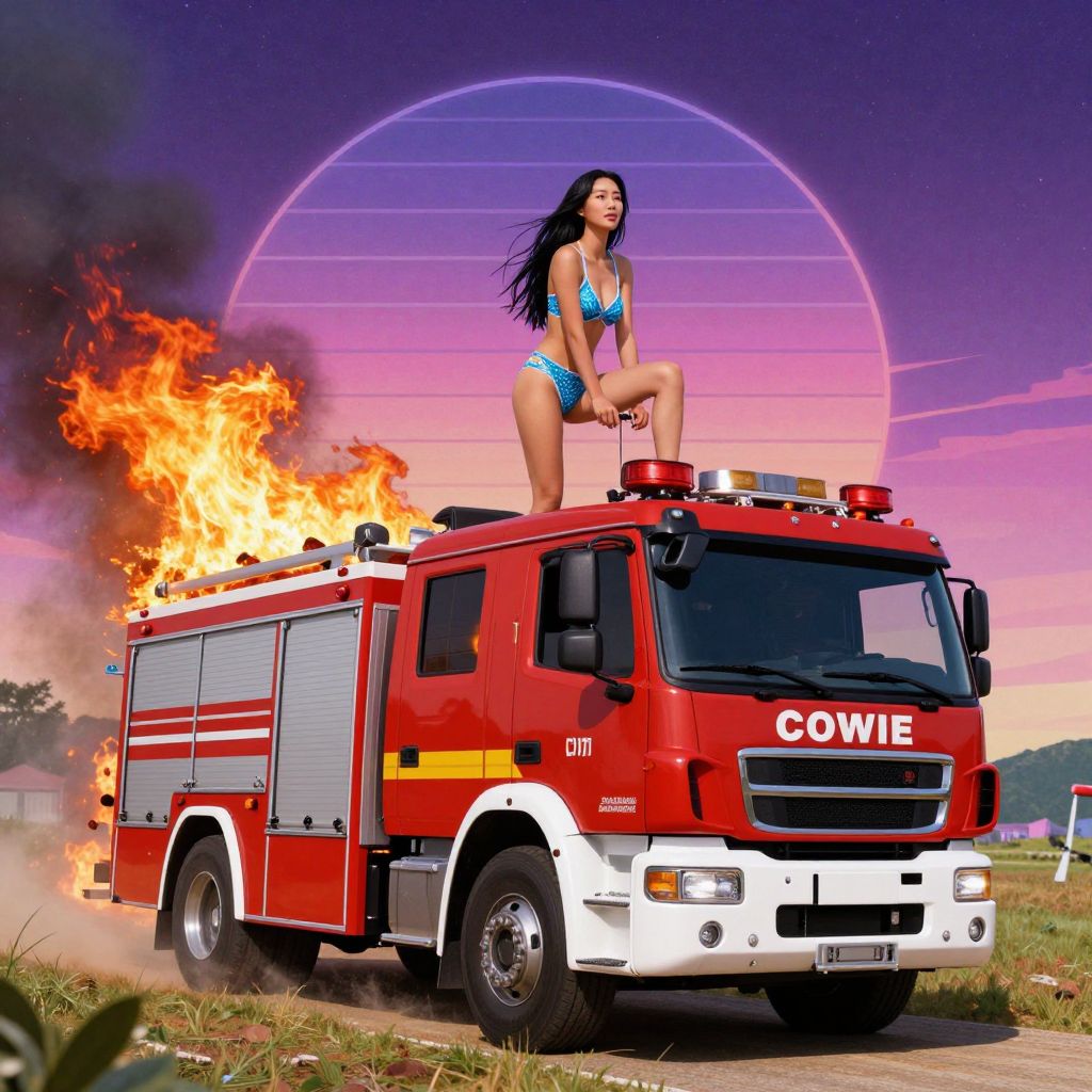 A korean woman riding on top of a burning firetruck off a hill, high quality, ultra detailed, a beautiful retrowave digital artwork, trending on artstation, masterpiece, 16 k