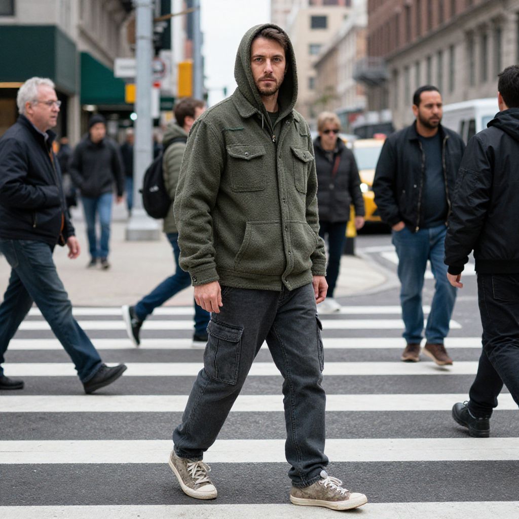 A man, urban explorer hooded flannel, olive green, dark gray cargo jeans, rugged canvas sneakers, black bomber jacket, busy crosswalk, medium format film, confident expression, city life energy. Man has masculine face and piercing eyes