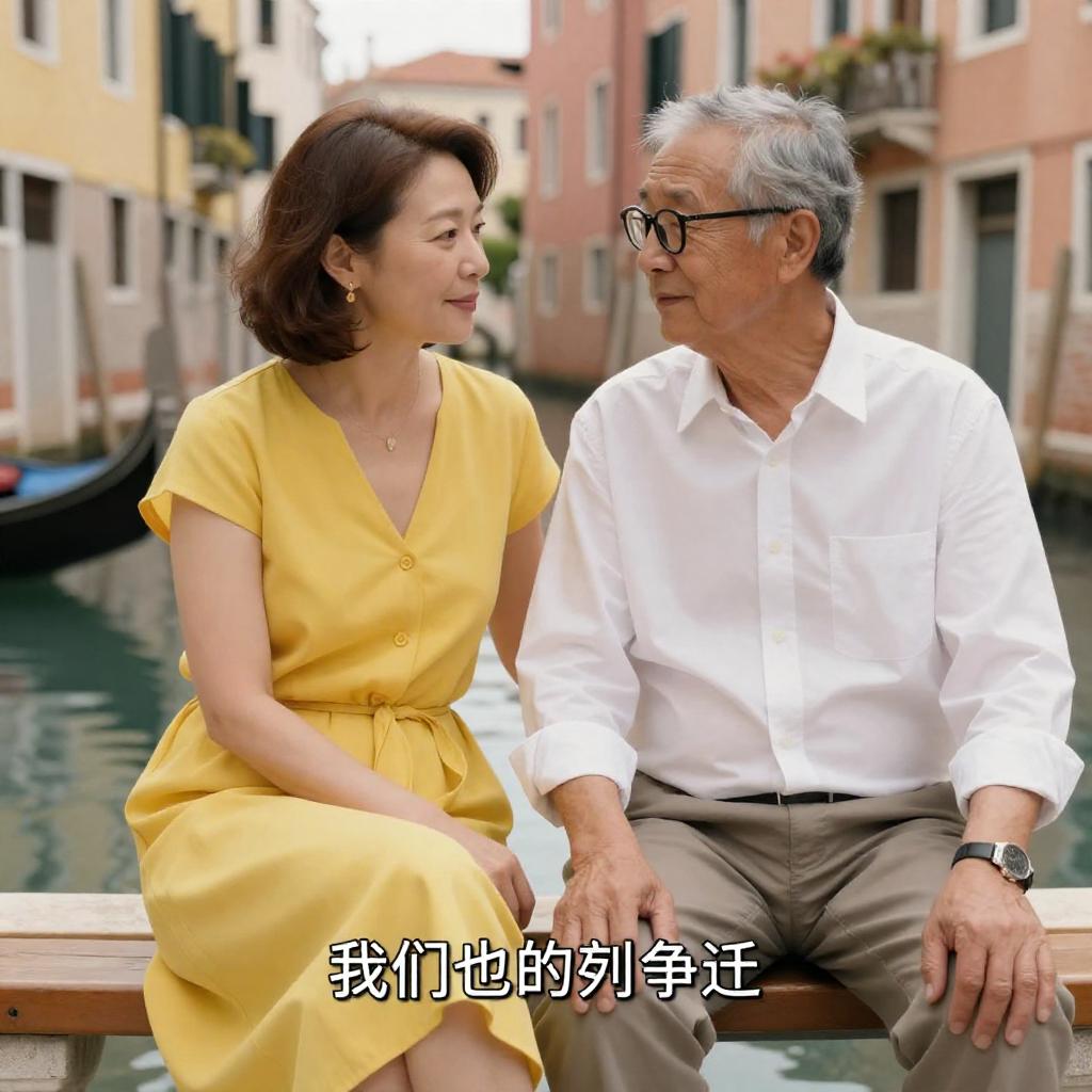 Photograph of a middle-aged woman with short brown hair in a yellow dress and a middle-aged man with glasses and a white shirt, sitting closely on a bench by a canal in Venice. The background shows colorful buildings and gondolas. The man looks at the woman with a gentle expression. Text overlay at the bottom.