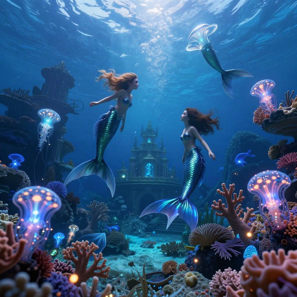 AI fantasy generator visualizing a mystical underwater kingdom inhabited by mermaids, glowing sea plants, and ancient ruins, set against a backdrop of shimmering coral reefs and translucent water, rendered in a dreamy and surreal art style with soft light and vibrant colors.