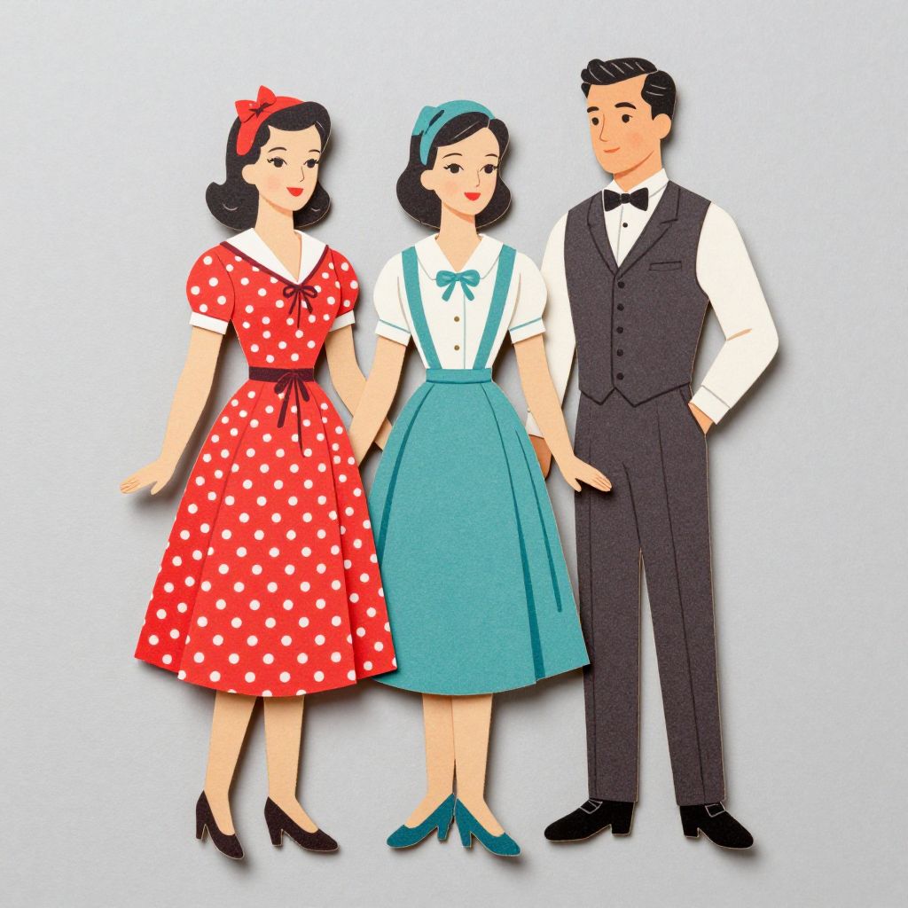 Vintage-inspired paper dolls featuring three characters dressed in classic 1940s attire, including a woman in a red polka-dot dress, another in a teal pinafore dress, and a man in a formal vest and bow tie, all standing side by side against a plain background.