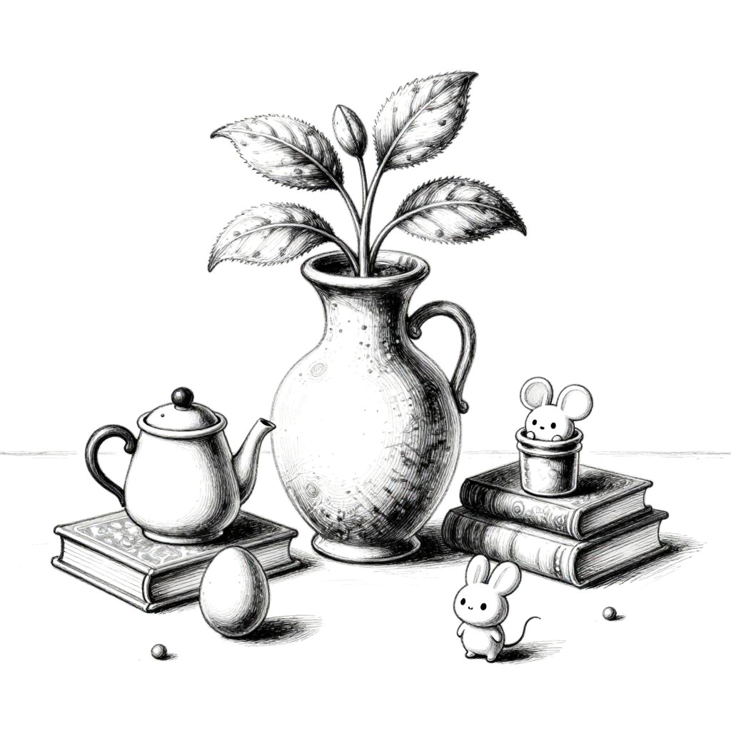 This black-and-white drawing features a whimsical still life. At the center is a large, round vase with a handle and a plant sprouting out of it. Surrounding the vase are various objects: a teapot, books, eggs, small jars, and tiny, cute, cartoon-like figures, including a rabbit and a mouse. The background is simple, with a white backdrop that contrasts with the detailed, sketchy lines of the foreground objects.