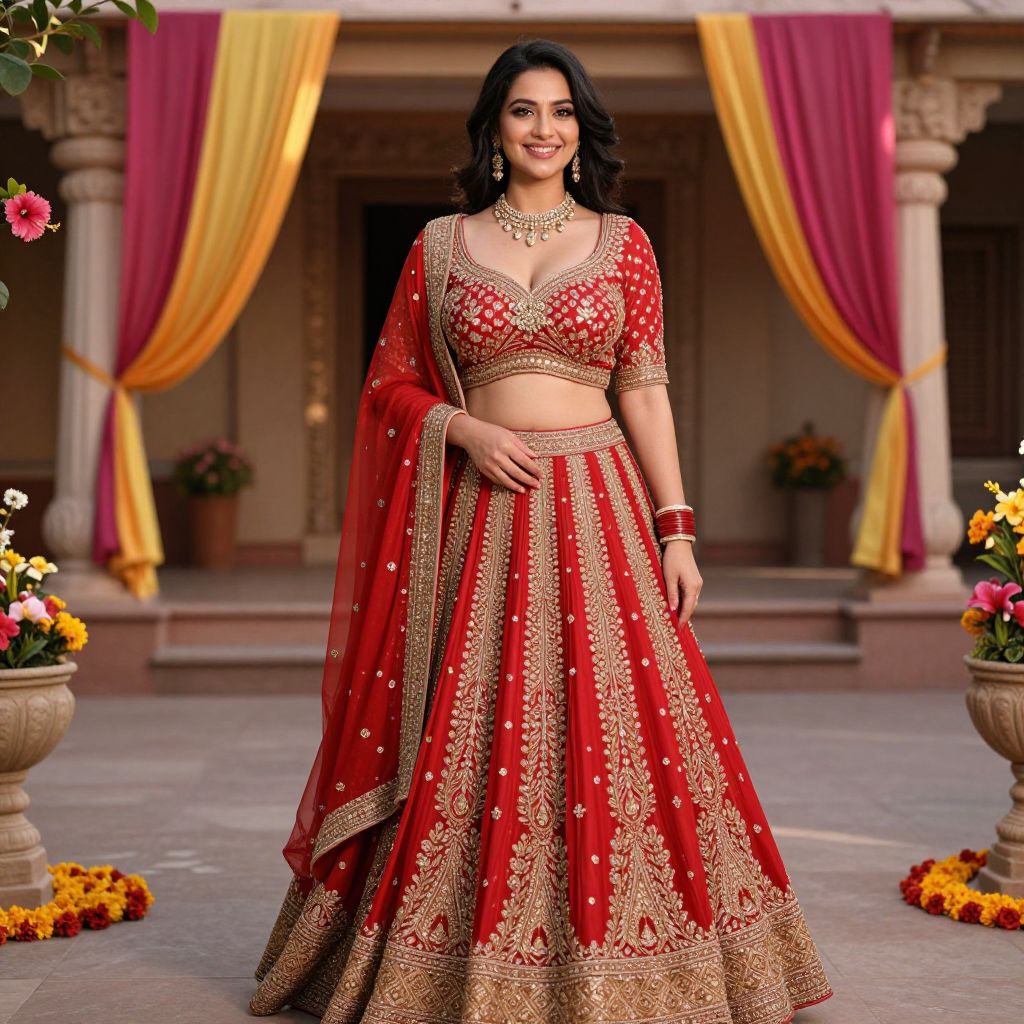 A stunning woman in her late 20s with medium-length black hair, warm brown eyes, and a radiant smile wearing a vibrant trending lehenga wedding costume, flowing red and gold fabric with intricate zari work, standing in a traditional Indian temple courtyard during golden hour, surrounded by flowering hibiscus and silk drapes in the background. The woman has big tits and cute face