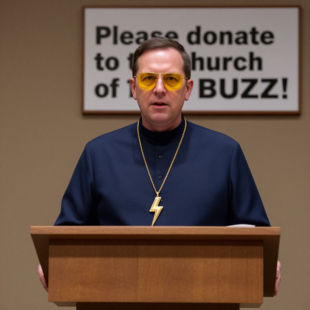 Man wearing yellow tinted glasses and a blue priest uniform inside auditorium behind podium preaching, he is wearing golden lightning bolt symbol necklace prominently visible, behind him is a sign with text \"Please donate to the church of BUZZ!\", No cross symbol