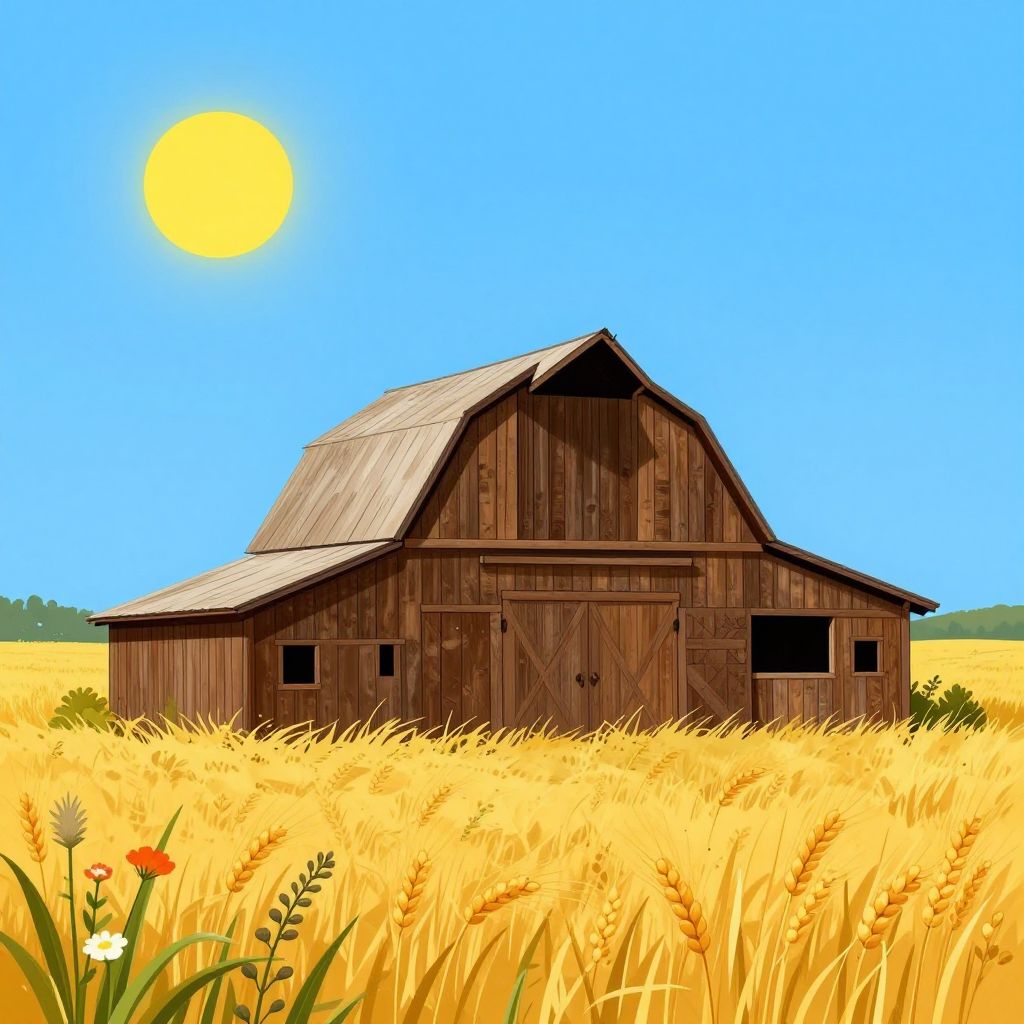 Illustration of a rustic wooden barn situated in a golden wheat field with flowering plants in the foreground under a blue sky with a bright yellow sun. The scene evokes a peaceful rural landscape with stylized lines and bold, contrasting colors.