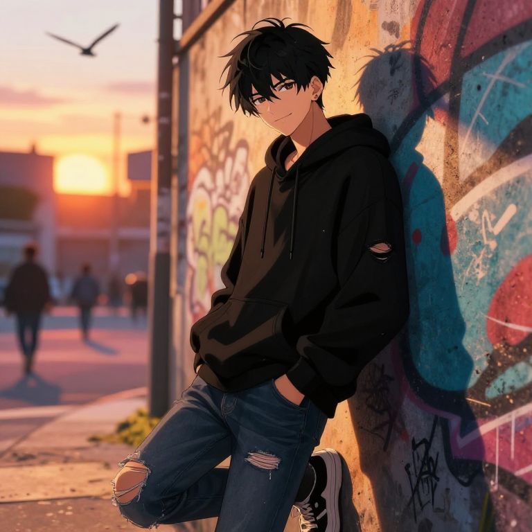 Bad boy anime boy with black hair leaning against a graffiti covered wall, wearing a ripped black hoodie and ripped jeans, confident smirk, sharp facial features, urban streetwear style, sunset casting long shadows, vibrant street scene with flying birds and blurred pedestrians.