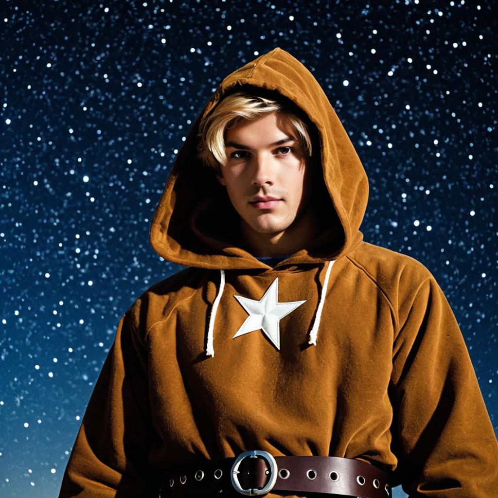 Portrait of a young man wearing a brown hoodie with a white star symbol on the chest, featuring a hood over his blonde and brown hair. He also wears a dark brown belt with metallic eyelets. The background showcases a clear, star-filled night sky, creating a striking contrast with the warm tones of his outfit.