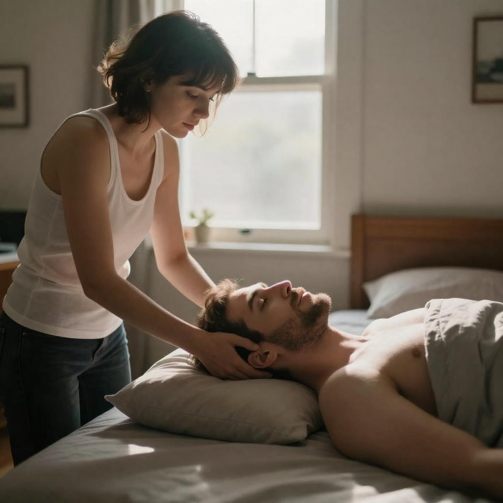 Photograph of a dimly lit bedroom. A topless woman with short brown hair and a white towel around her waist leans over a bed, touching a man's leg. The man is partially covered with a gray blanket, lying on his back. A black cat is on the floor near the bed. Bright light from a window in the background.