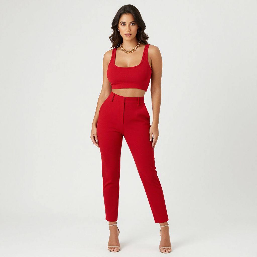 Photograph of a confident woman with medium skin tone and dark wavy hair, wearing a red crop top and high-waisted red pants, accessor