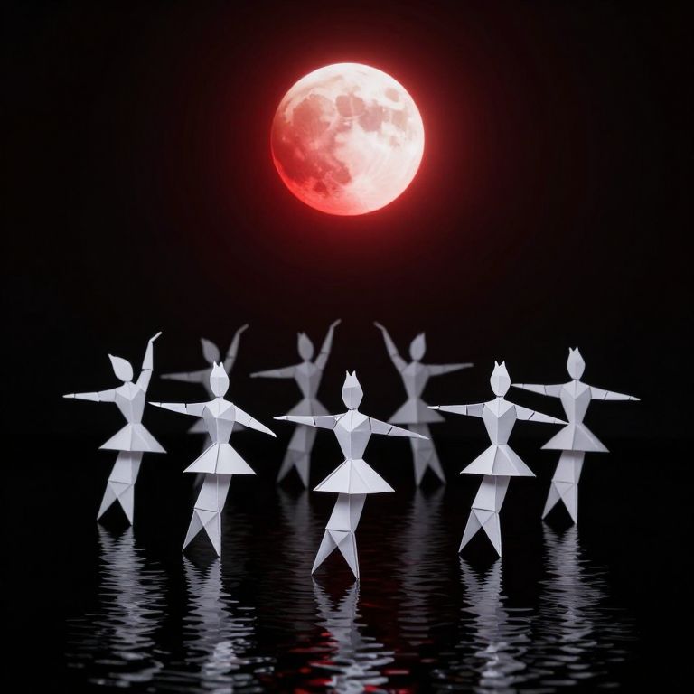 Suspended between the ethereal glow of a crimson eclipse and the serene surface of a black lake, a troupe of paper-folded dancers gracefully defies gravity, embodying the delicate balance between fragility and transcendence, their silent performance echoing the timeless dance of life and the cosmos.