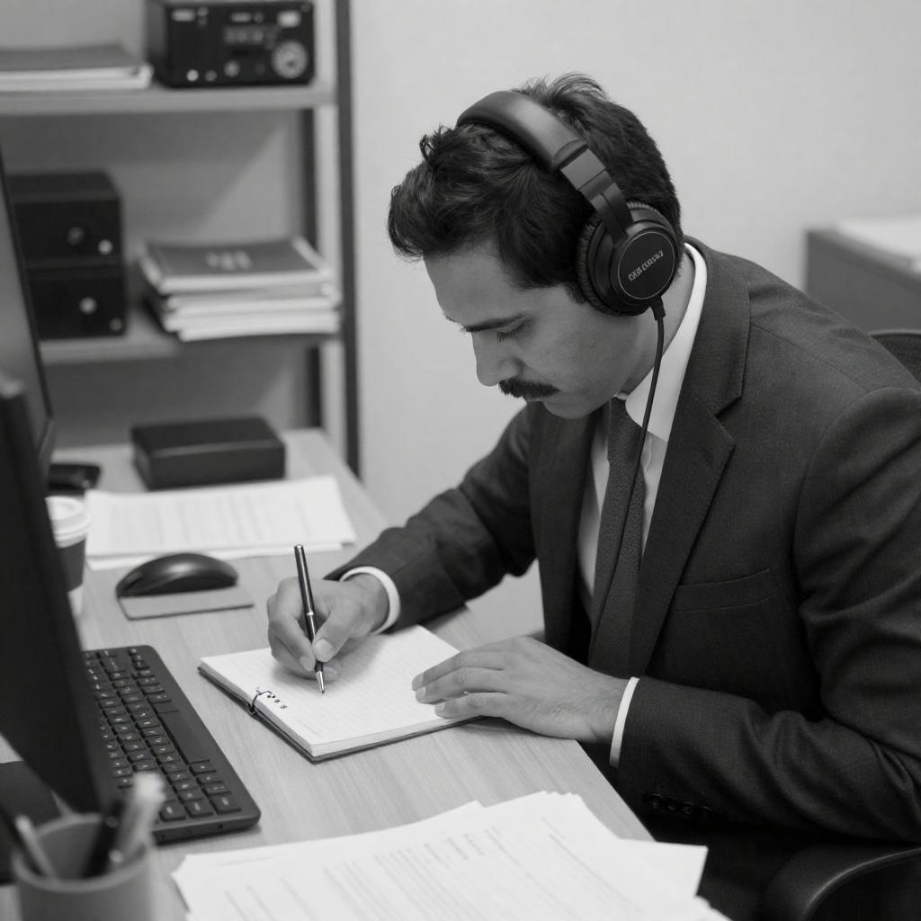 Black-and-white photograph of a man in a dark suit, headphones, and mustache, writing in a notebook at a cluttered desk. Background has shelves with equipment and papers. Desk has papers, pens, and a coffee cup. Man has focused expression.