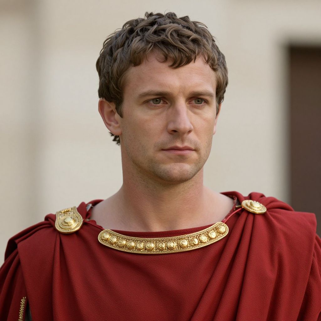 Augustus caesar costume, a close up of a man in a red robe and gold necklace