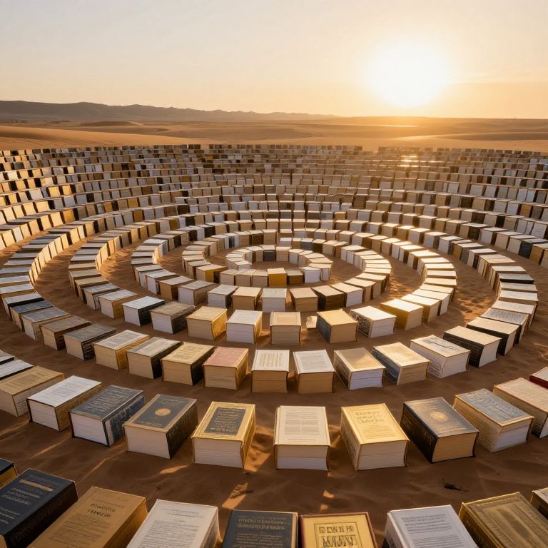 Books meticulously arranged in concentric spirals stretch endlessly across a sunlit desert, their golden spines forming a mesmerizing living mosaic that radiates warmth and knowledge under the setting sun.