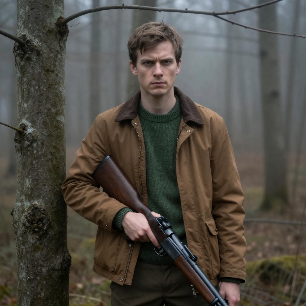 Photograph of a young man with light brown hair, serious expression, holding a rifle diagonally across his chest. He wears a white shirt and dark vest. Background is ured green and brown.