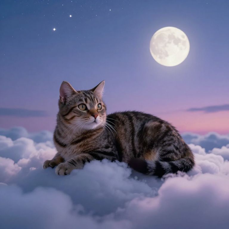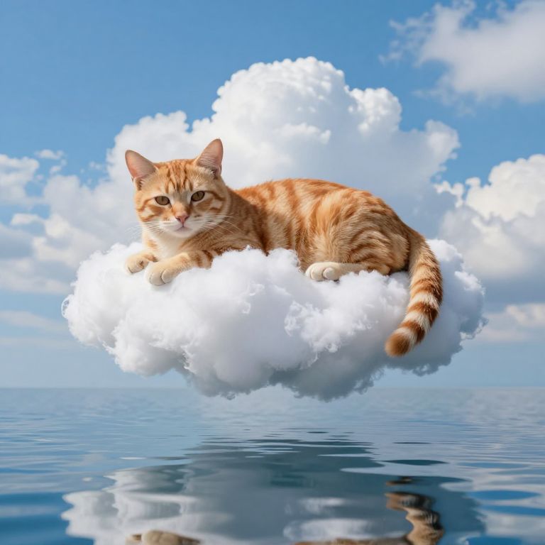 Ginger-striped cat rests peacefully atop a fluffy white cloud, floating serenely above a tranquil ocean with its reflection mirrored perfectly beneath, set against a backdrop of vibrant blue sky dotted with voluminous cumulus clouds.