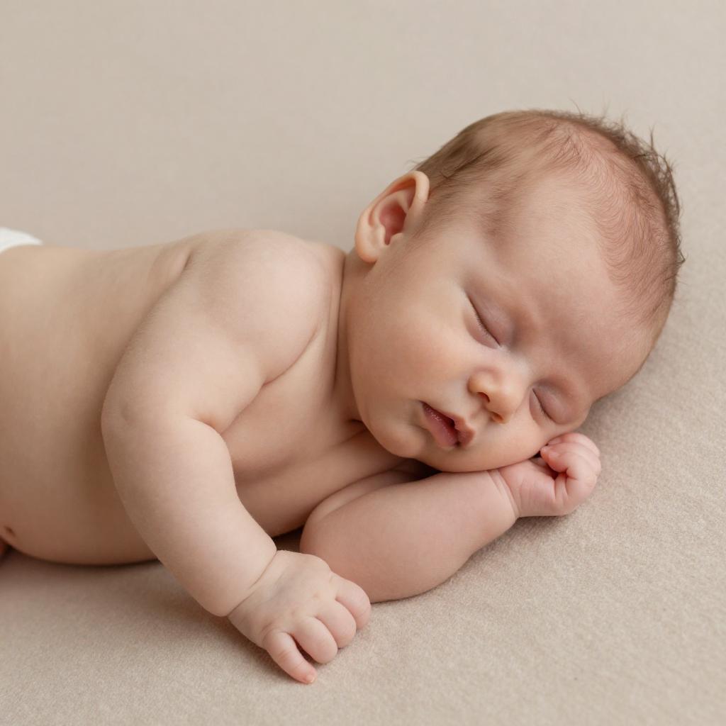 Photograph of a sleeping, nude baby lying on a soft, beige surface. The baby is curled up on their side, with one hand near their face and the other resting on their chest. The baby has light skin and fine, light brown hair. The lighting is soft and even, creating a gentle, warm glow. The camera angle is slightly above and to the right, capturing the baby from a three-quarter view. The background is blurred, with a shallow depth of field that keeps the focus on the baby.