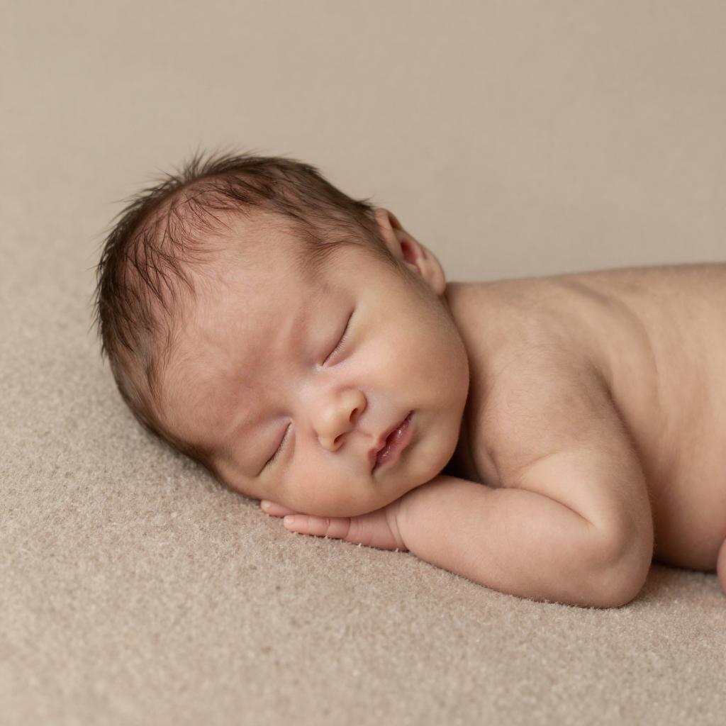 Close-up photograph of a sleeping newborn baby with light skin and fine light brown hair lying on a soft beige surface. The baby is nude, curled up on their side with one hand near the face and the other resting on the chest. The image features soft, even lighting and a shallow depth of field that keeps the focus on the baby.