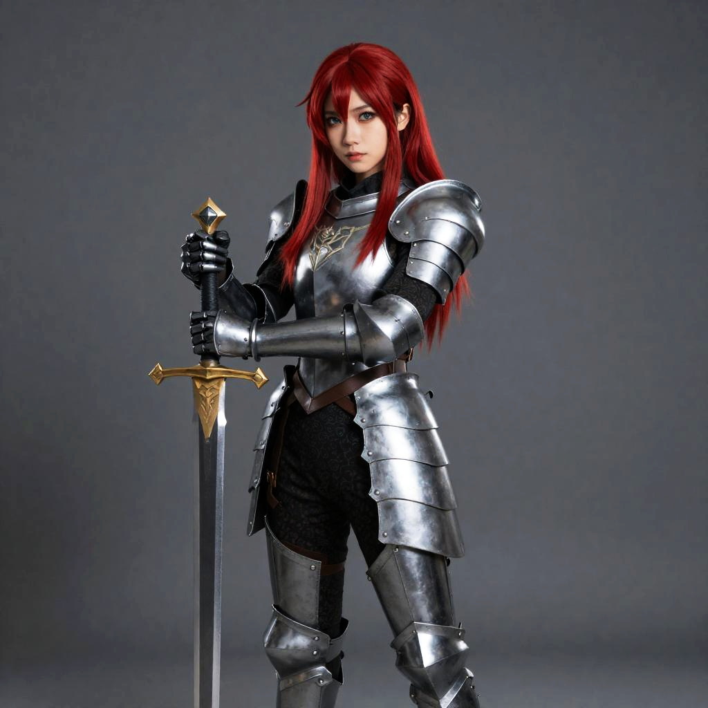Woman in Silver Armor with Red Hair Holding Sword