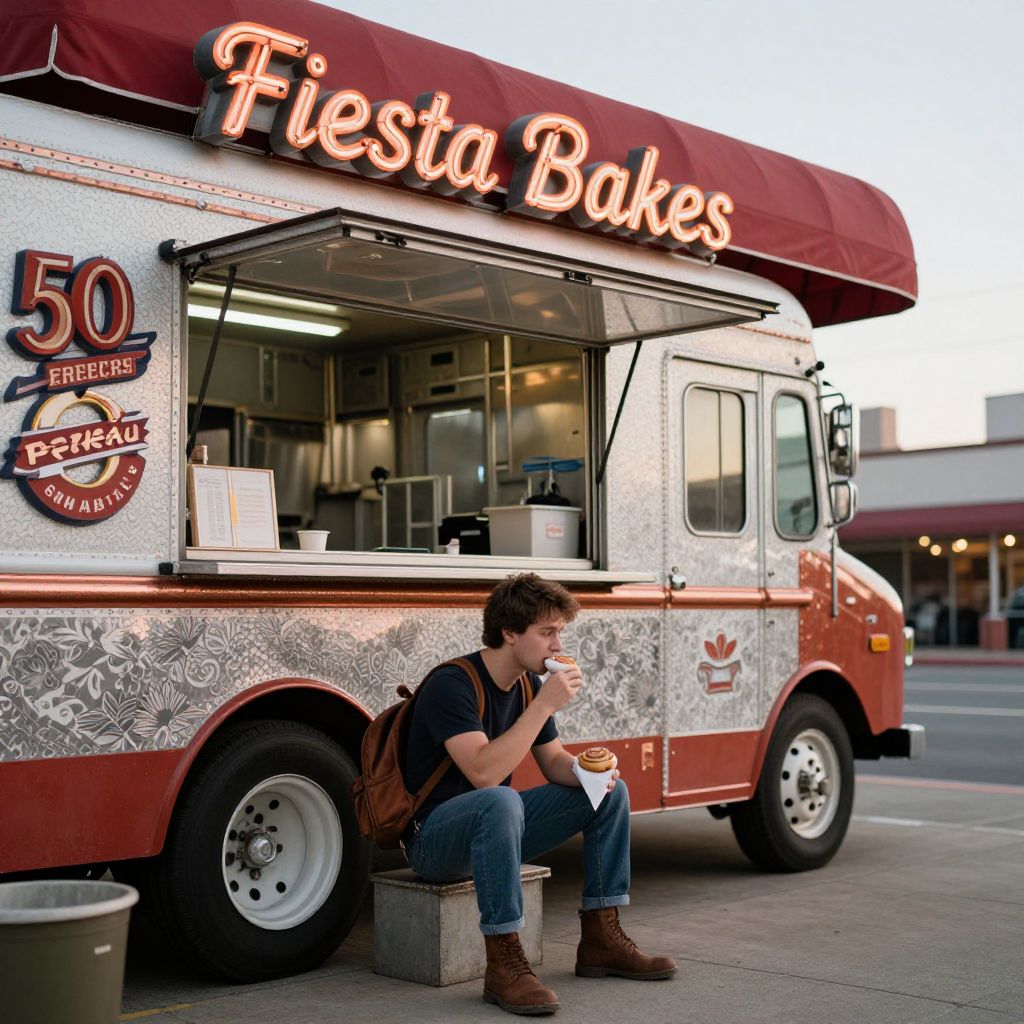 An afternoon scene in a nostalgic downtown marketplace, where a vintage food truck with a vintage '50s neon sign reading 'Fiesta Bakes' is parked under a red awning, decorated with copper details and vintage signage; a young man with short brown hair and a leather backpack sits on a step, eating a cinnamon roll from a paper cone, with the cityscape blurred softly in the background.