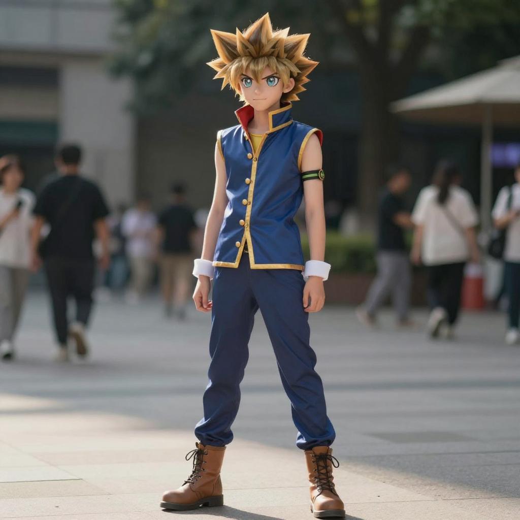 Photo-realistic cosplay photo of person in mutou yuugi costume. Full body. Standing. Full length. , professional photoshoot