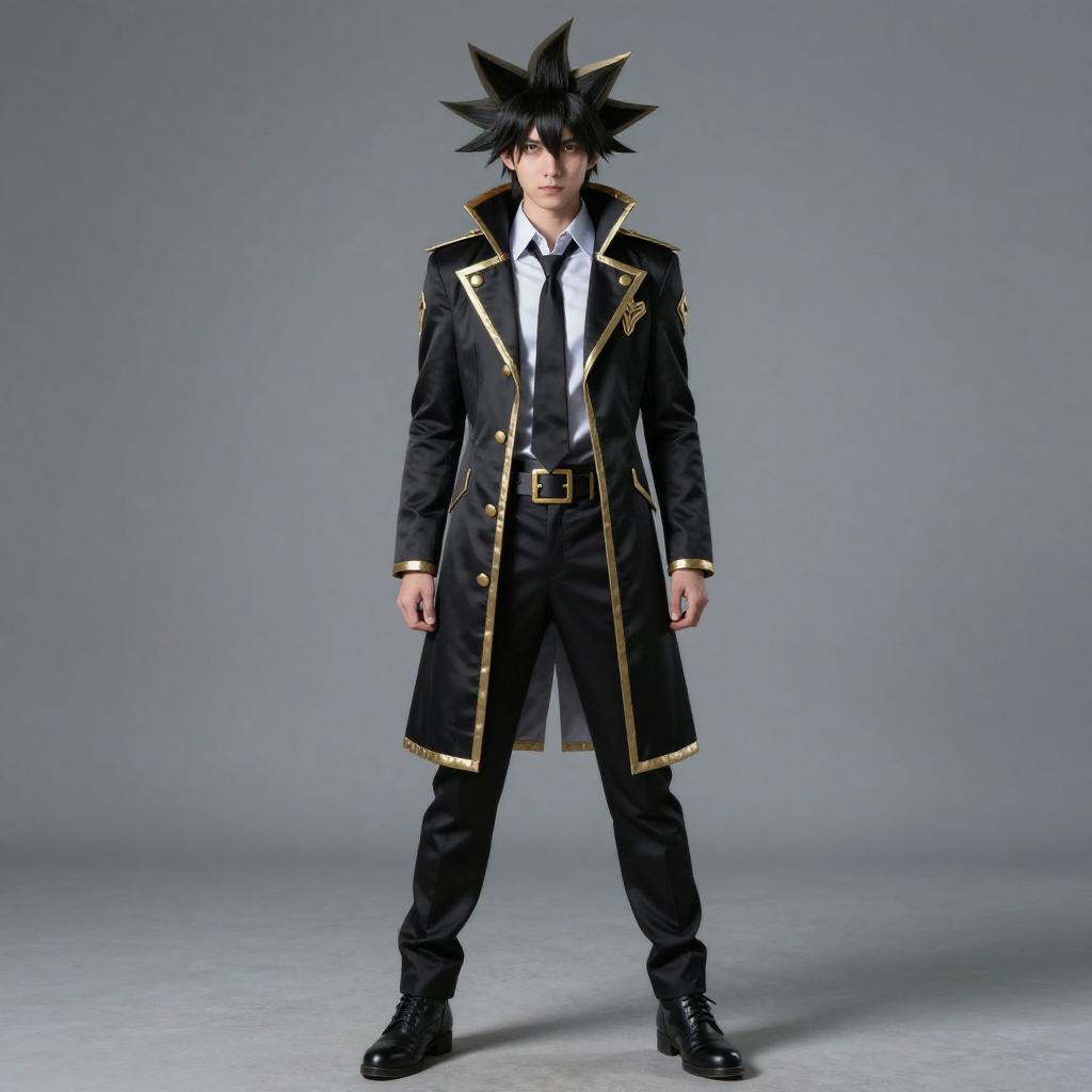 Photograph of a young man with spiky black hair standing against a plain gray background. He wears a long, black, military-style coat with gold trim, a white dress shirt, black tie, and black pants. His outfit is completed with black shoes and a black belt with a gold buckle. The man's expression is neutral, and he stands with his hands by his sides. The lighting is even, highlighting the textures and details of his clothing. The overall style is formal and dramatic, with a slightly gothic or Victorian influence.