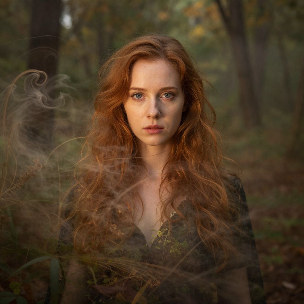 Photograph of a fair-skinned, red-haired woman with wavy hair and intense gaze, standing in a misty forest, surrounded by swirling fog