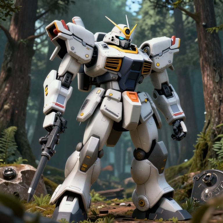 A large, detailed mecha from the \"Battletech\" franchise stands in a forested area, with enhanced sharpness and ultra-HD quality.