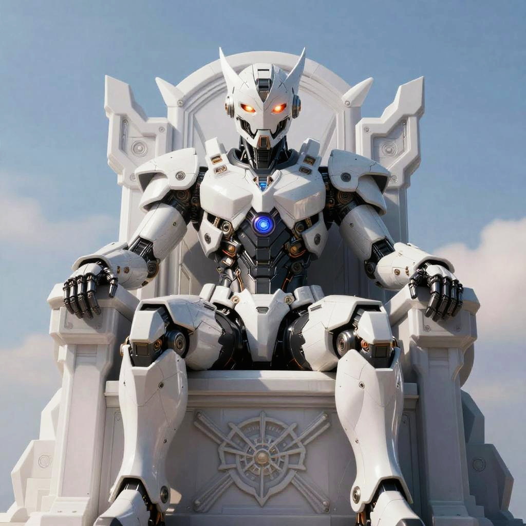 Masterpiece, highly detailed CG unified 8K wallpapers, 8k uhd, dslr, high quality, clean, best illumination, ((a god in a black and white mechanical armor, sitting on the throne, godly aura, magical, in the sky)), glowing eyes, cinematic, ultra-high resolution, ultra-high detailed, high-definition