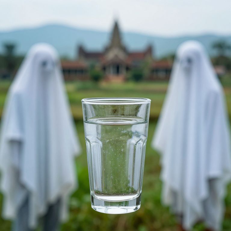 Photograph of a clear glass with water in the foreground, two blurred ghost-like figures in white cloaks, and a distant, out-of-focus traditional