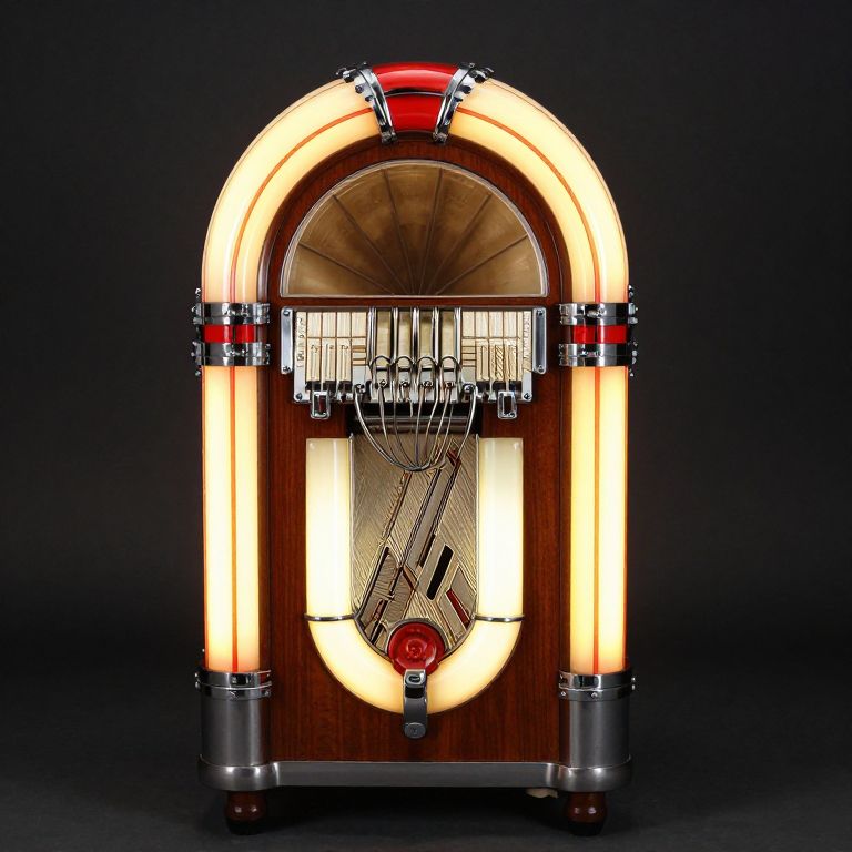 Photograph of a vintage-style jukebox with illuminated arches, wood paneling, chrome accents, and a red record button, set against a