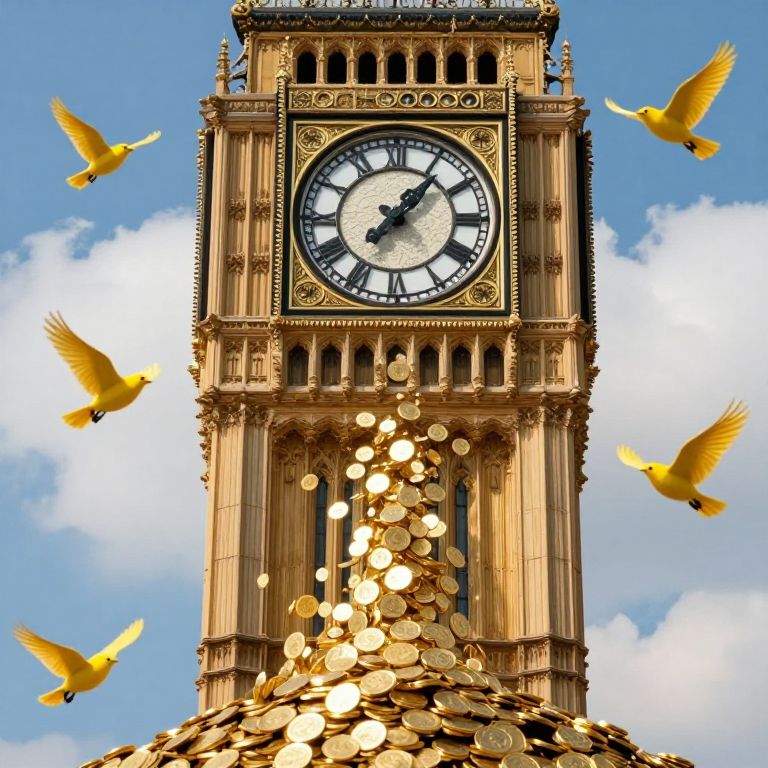 Photograph of the iconic Big Ben clock tower against a bright blue sky with scattered white clouds. The golden-brown, ornate clock tower is adorned with detailed carvings and a large, black Roman numeral clock face. Golden coins are cascading down from the top of the tower, creating a sense of motion. Five vibrant yellow birds with outstretched wings are flying around the tower, adding a dynamic element to the scene. The coins and birds contrast sharply with the clock tower's intricate design and the clear sky, creating a visually striking image.