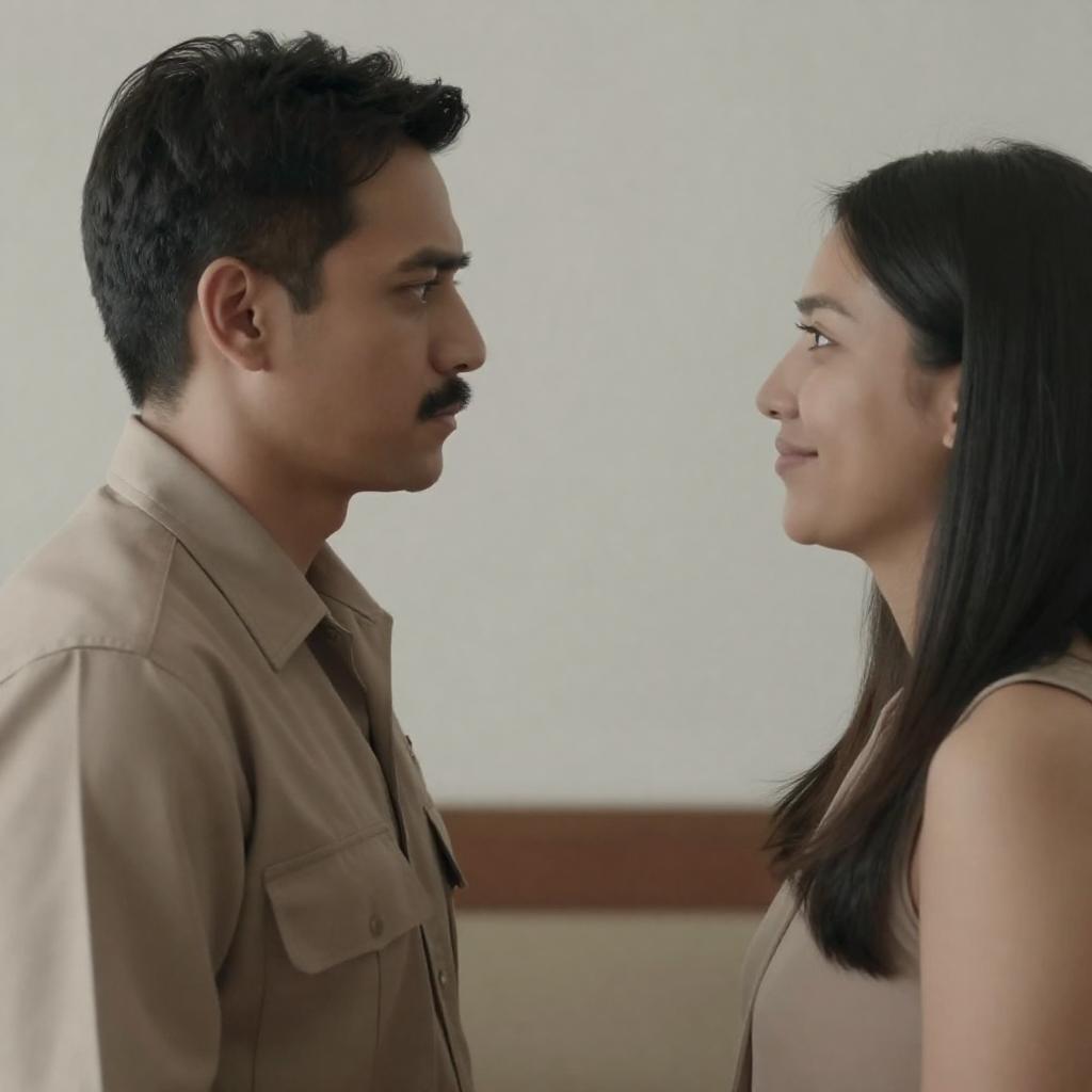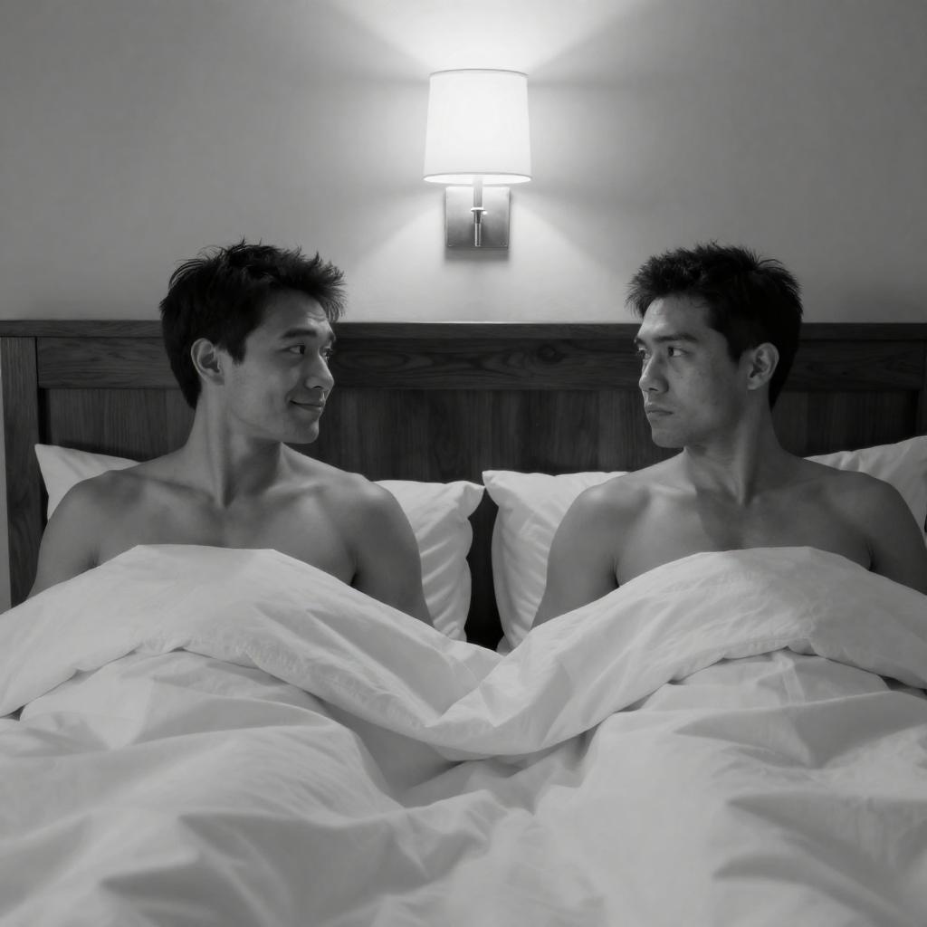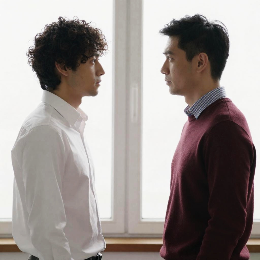 Photograph of two men standing close, facing each other. The man on the left has short dark hair, light skin, and wears a green shirt. The man on the right has short dark hair, light skin, and wears a blue tank top. They are inches apart, eyes locked, with a neutral indoor background.