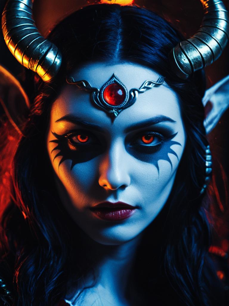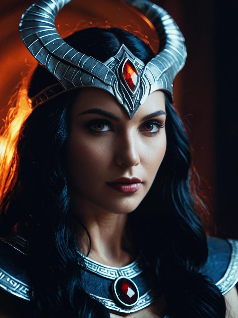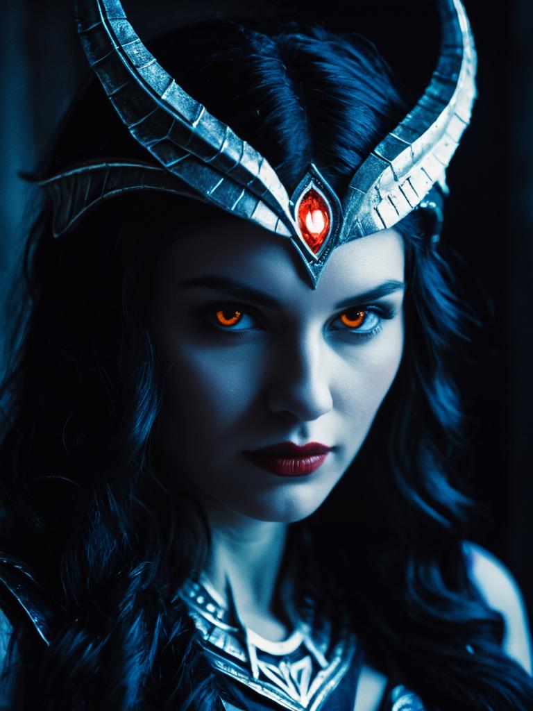 Woman in Lilith Goddess Costume, close-up detailed headshot with glowing eyes