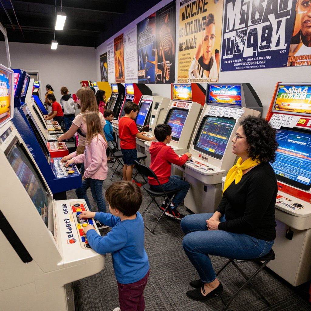 A high-resolution photograph of a retro arcade at a community center during a holiday weekend, filled with families enjoying classic games, a woman in her 40s with curly black hair and a bright yellow scarf sitting on a folding chair, watching her nephew play a 'Missile Command' game, the arcade walls lined with vintage cabinets showing faded advertisements and handwritten notes about 'the best game of all time'.