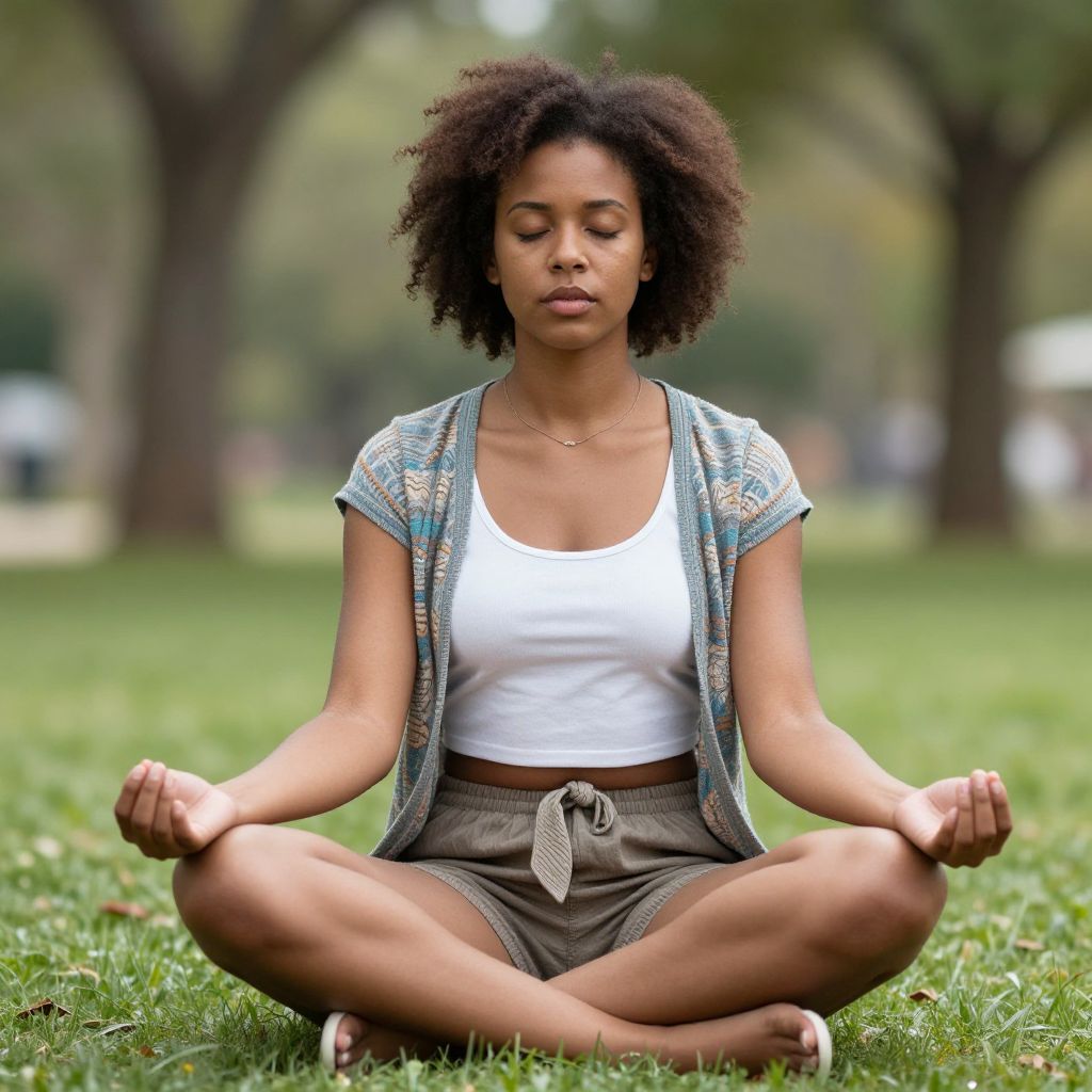 Photograph of a young Black woman with curly hair, meditating cross-legged on grass in a park, wearing a white tank top, patterned card