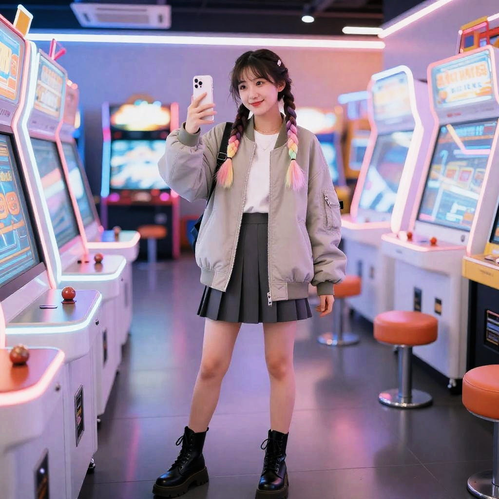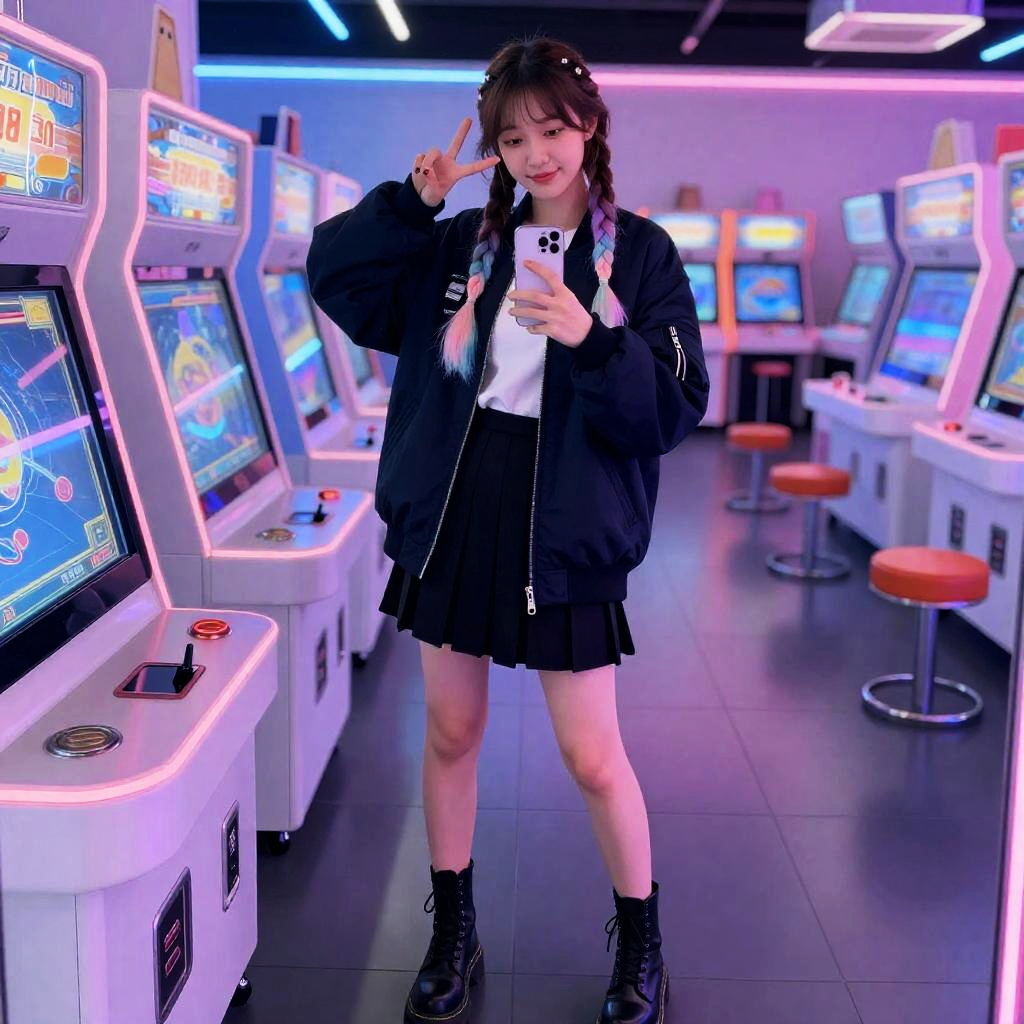 A young woman with pastel rainbow braids is taking a selfie in a neon-lit arcade, wearing a stylish oversized bomber jacket, pleated skirt and chunky boots. She poses with a cheerful peace sign, captured in a semi-realistic style.