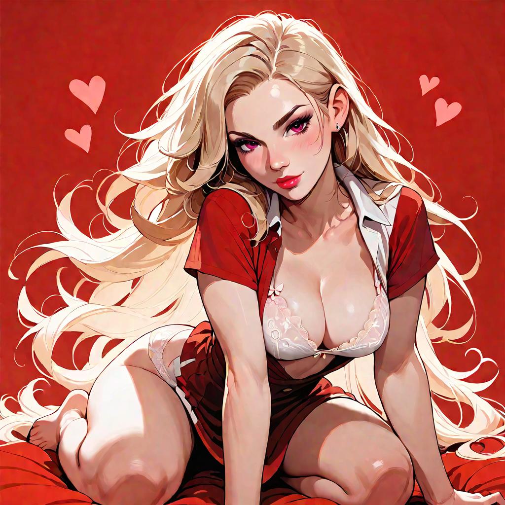 Score_9, score_8_up, score_7_up, 1 girl, blonde hair, flat style, flat colors, long hair, seducing viewer, hearts, female focus, black unbuttoned business shirt, white lace bra, white lace panties, posing, suggestive pose, kneeling, red theme, (red) and white background, posing for a magazine cover