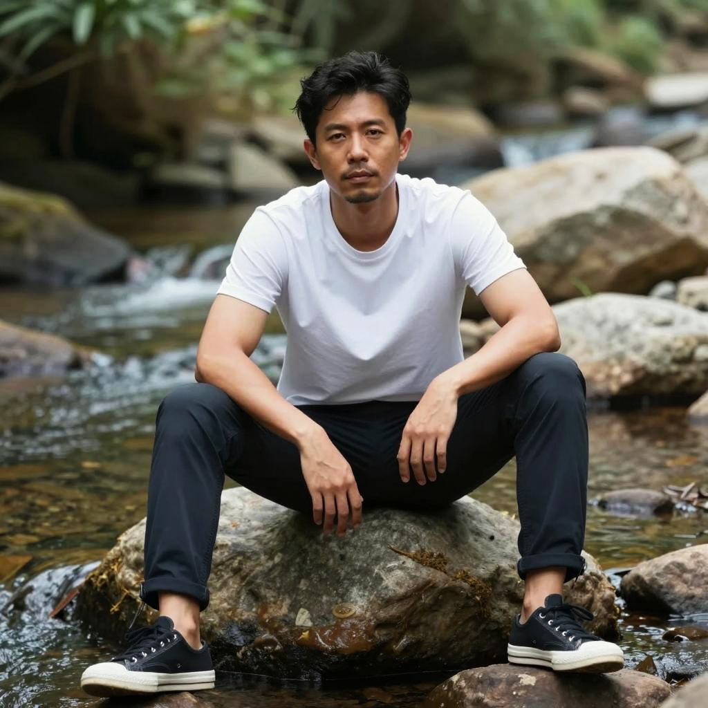 Portrait of an Asian man wearing a dark green jacket and black shirt, standing confidently on a balcony with a blurred city nightscape background. The scene captures a moody, contemplative atmosphere with city lights softly glowing in the distance.