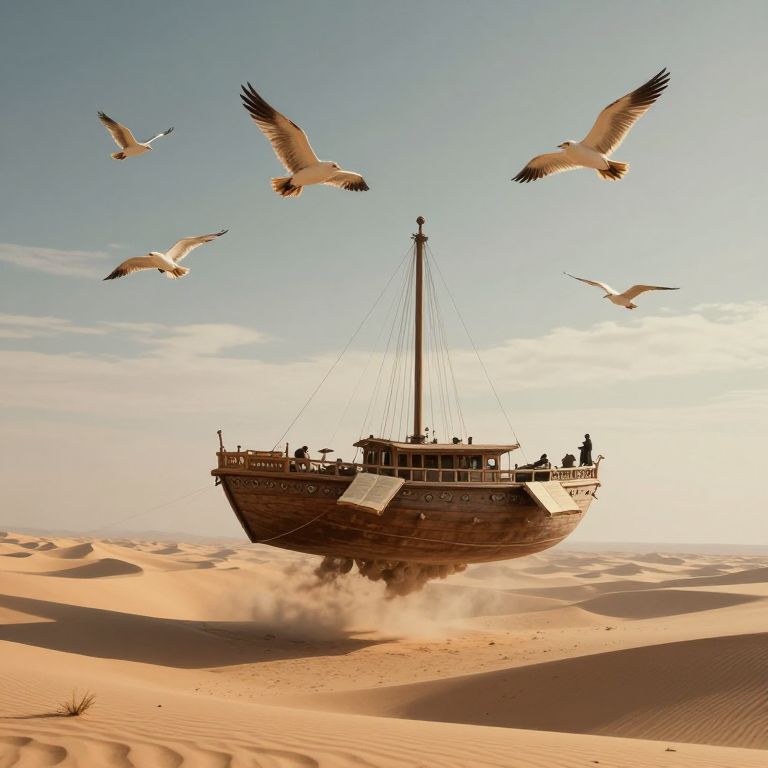 Photograph of a vintage wooden ship with a tall mast, gliding across golden sand dunes under a clear blue sky. Four white seagulls fly overhead, casting shadows on the sunlit desert. The ship is slightly tilted, creating a trail of dust behind it. The ship's deck has several small figures, possibly passengers, silhouetted against the bright sunlight. The sand dunes have gentle, ridged textures, and the overall scene evokes a sense of adventure and timelessness in a desert landscape.