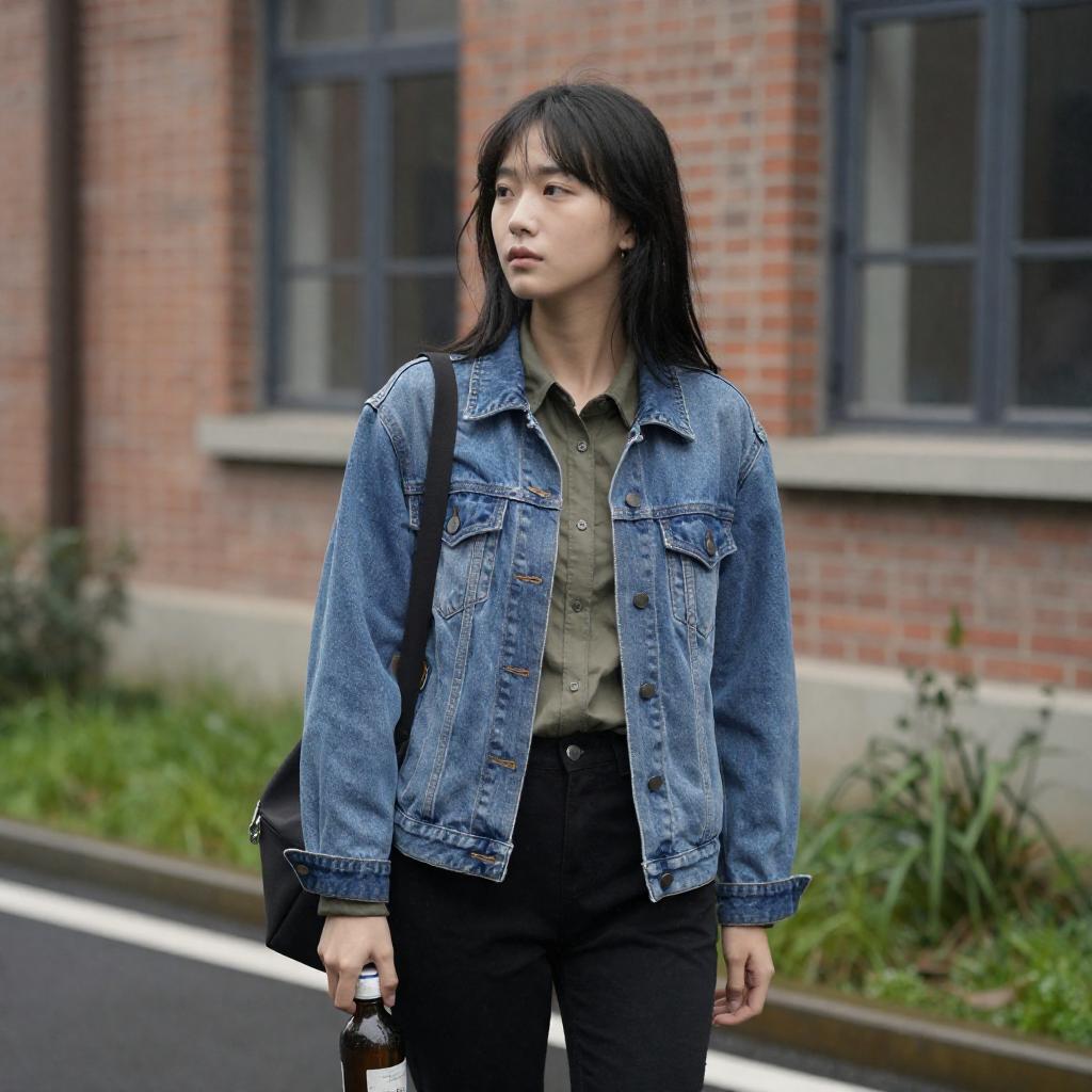 Photograph of a young woman with medium-length black hair, wearing a dark brown cardigan over a pink ribbed shirt, and blue jeans. She holds a brown leather strap and a large, ured gray bag with brown accents. She stands against a dimly lit, graffiti-covered wall, looking directly at the camera with a neutral expression.