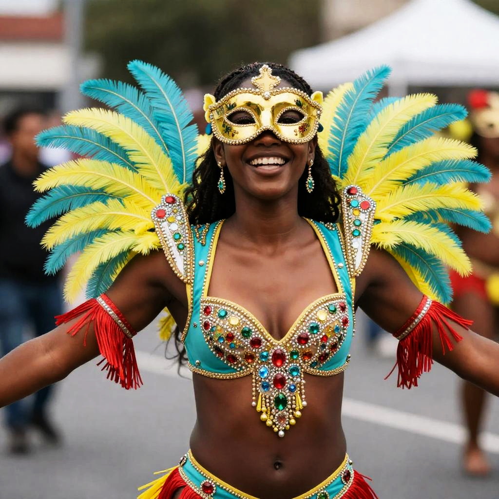 Mardi gras outfit, worn by carnival performer, featuring elongated striped trousers with flowing capes and feathered headpiece, in sunset oranges, magentas, and gold.
