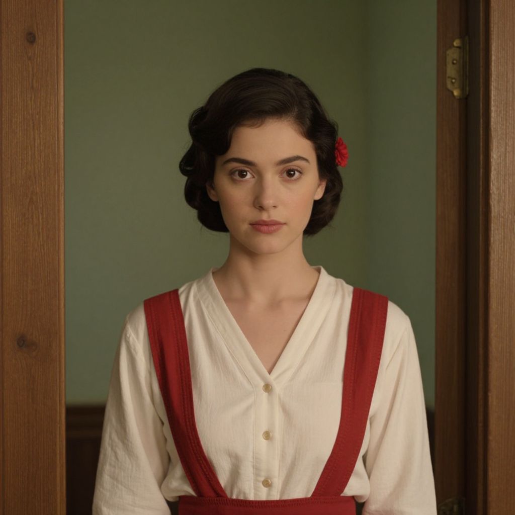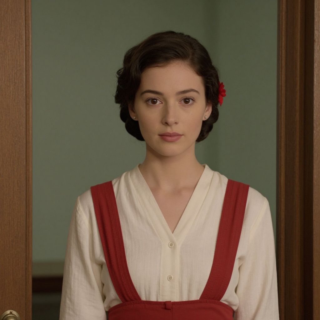 Woman depicted in a serene portrait, wearing a cream blouse and red overalls, with neatly styled dark hair adorned by a small red flower, set against a muted green wall and framed by a wooden door.