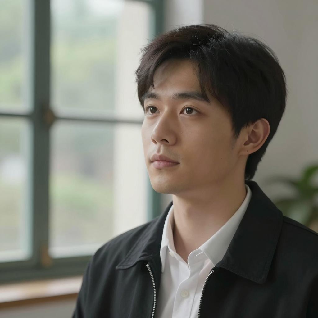 Close-up portrait of a young Asian man with dark hair and an intense expression. He has small fresh scratches on both cheeks and is wearing a dark high-collar jacket. The background is blurred dark green, suggesting an outdoor environment.