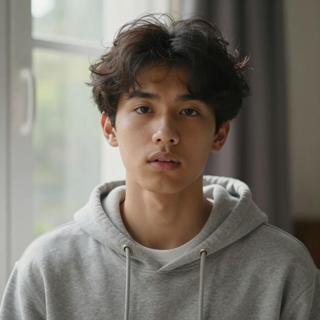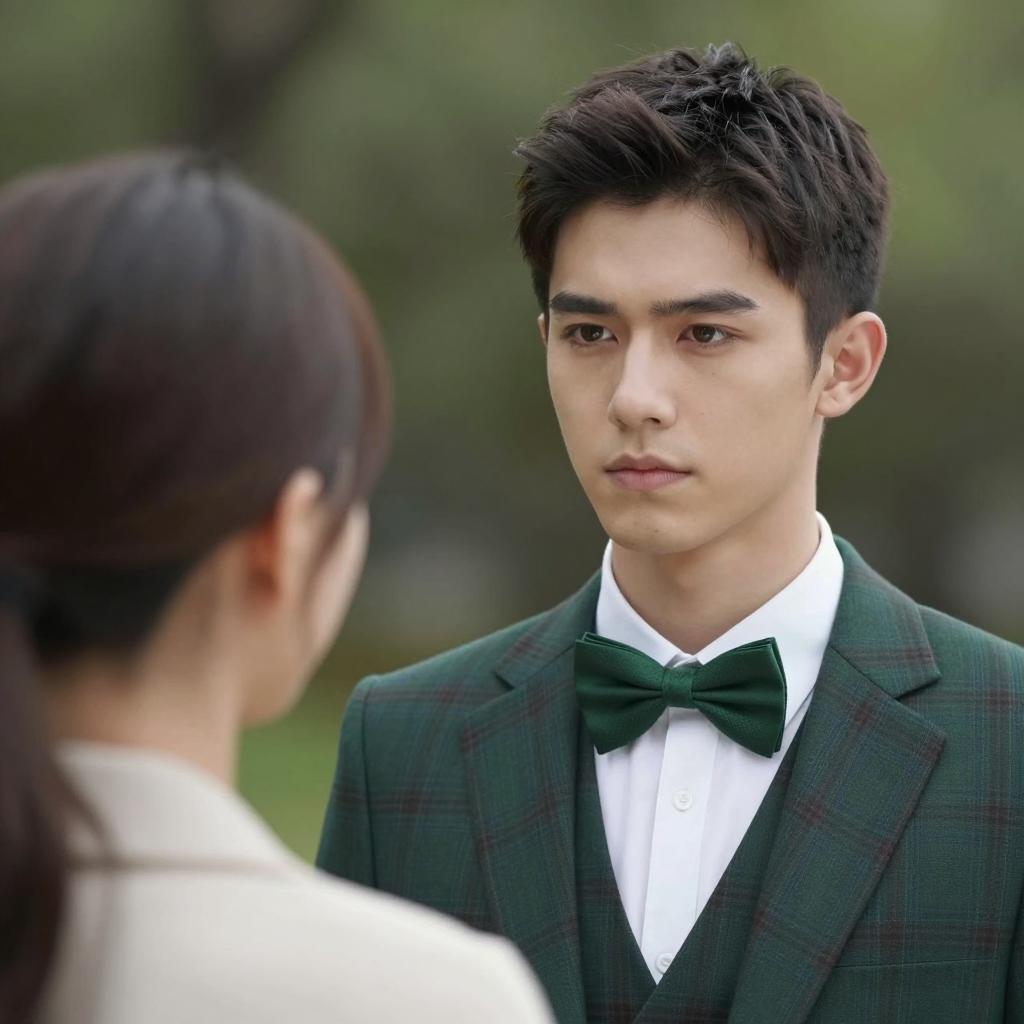 A young man with dark hair, intense expression, and slightly open mouth. He has a small scratch on his right cheek and wears a dark high-collar jacket. Background is blurred and dark green.