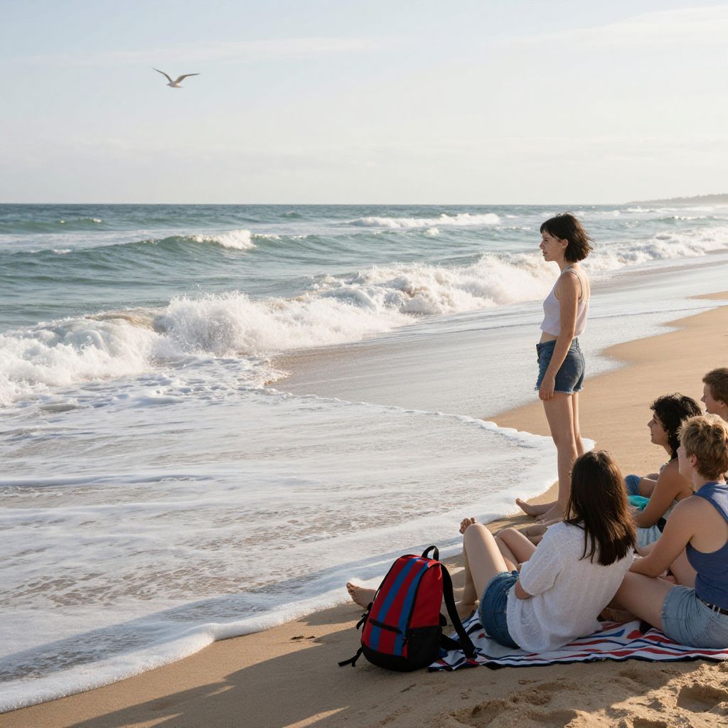 Photograph of a sunny beach scene with five young people. A girl with short, dark hair stands in the shallow water, wearing a white tank top and denim shorts. To her right, three others sit on a striped towel, two with curly hair and one with straight hair, all in casual summer clothes. A red and blue backpack rests on the sand beside them. The ocean waves gently crash against the shore, and a seagull flies in the bright blue sky. The sand is golden, and the water is a mix of blue and white.