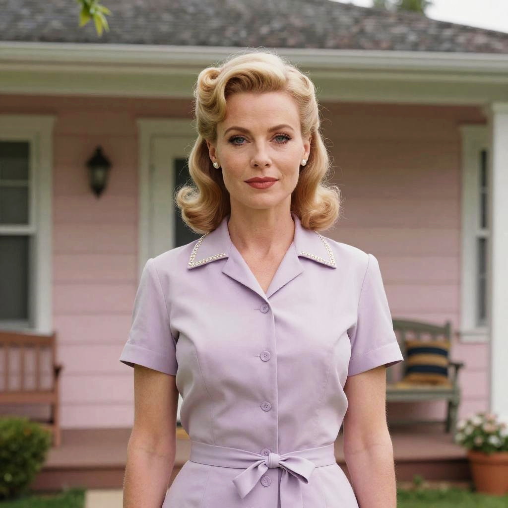 Characteristics of a Stepford wife portrayed in a 1950s style kitchen, smiling perfectly, immaculately dressed in vintage pastel dress, soft lighting, retro aesthetic, hyper-realistic