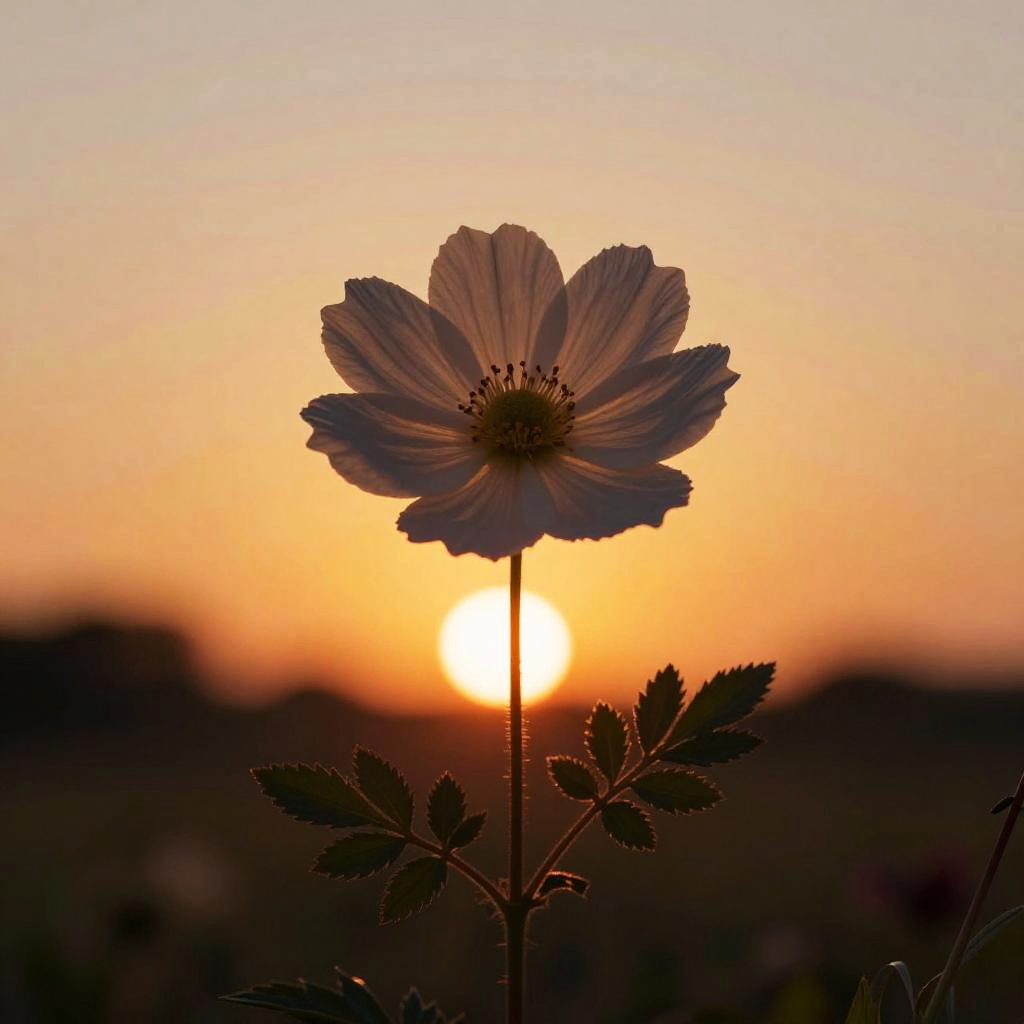 Realistic flower silhouette against a vibrant sunrise, sharp and delicate outlines softened by warm glowing hues, with intricate leaf patterns and a hint of surrounding meadow flora in a tranquil nature setting